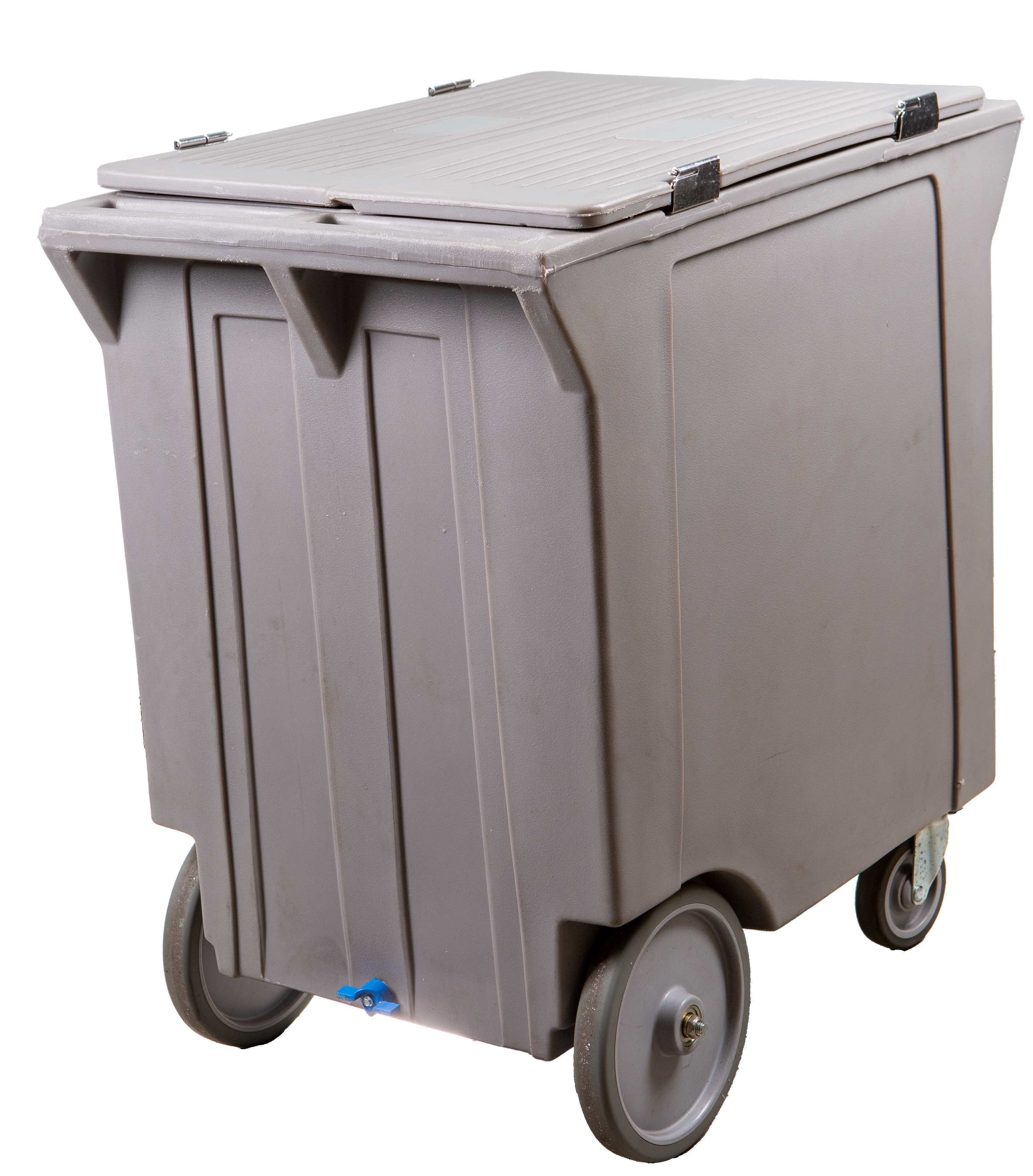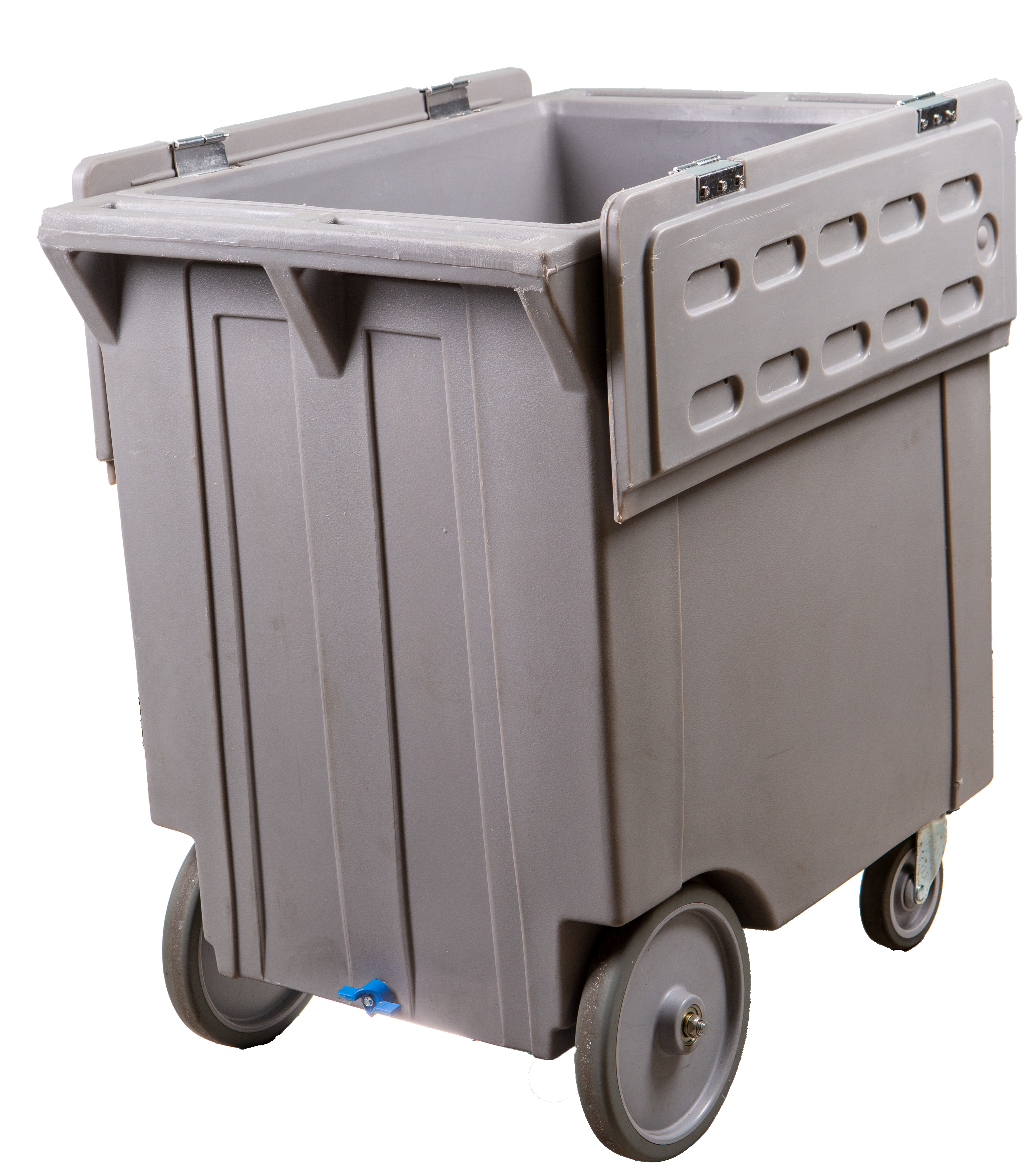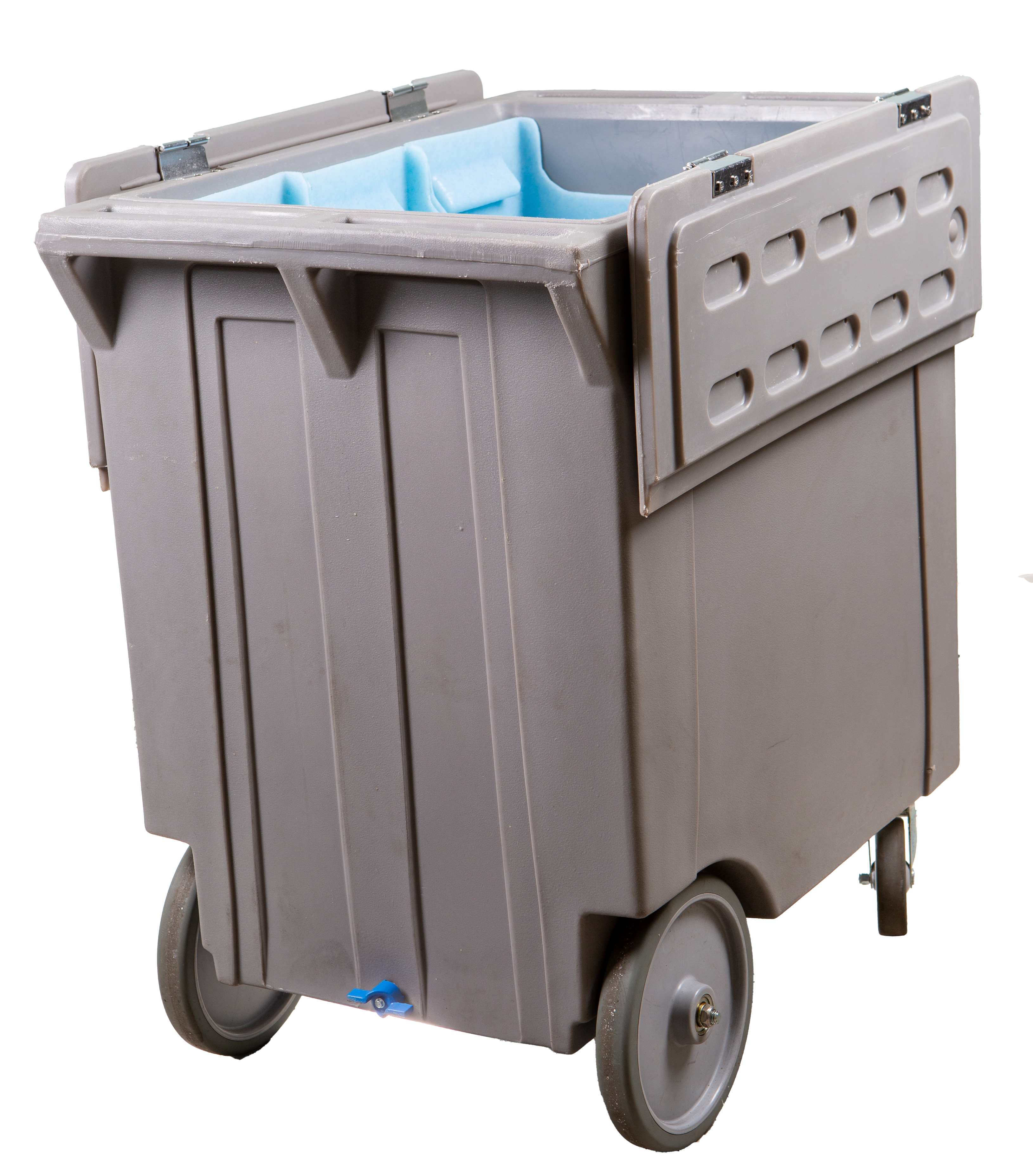 Howe Mobile Express polyethylene carts hold approximately 200 lbs. (90.7 kg) of ice each. Insulated polyethylene cart tops are hinged to fold down out of the way when in use. By remaining hinged to the cart, potential for cross contamination and loss of top is reduced. Special hinges allow for removal of top for cleaning and sanitizing.